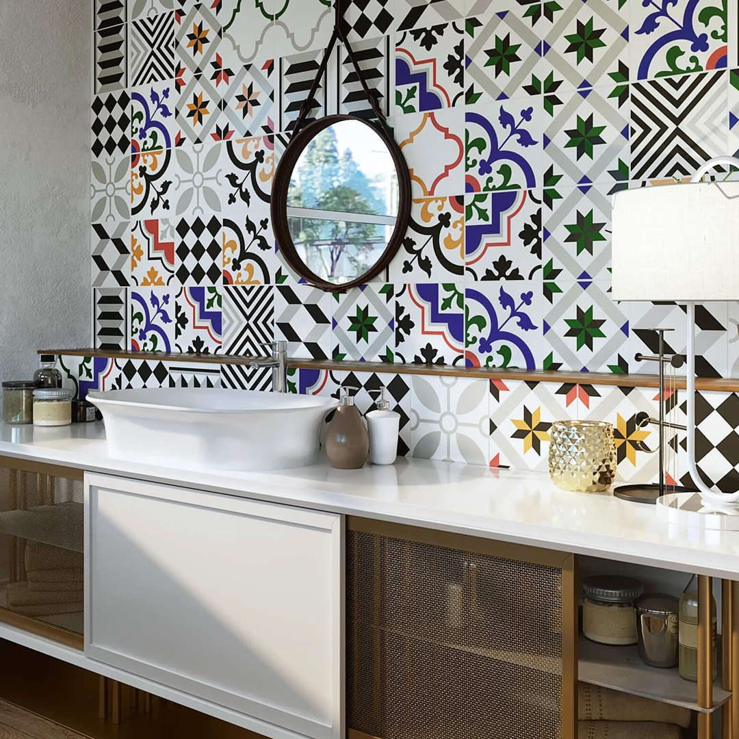 На матовой поверхности декоров Ателье геометрические узоры яркими красками, необычные сочетания цветов. Можно собрать совершенно разные полотна с оригинальным принтом. Плитка удобного формата 20х20 см – украсите просторное помещение и маленькую ванную. Создадите акцент любого размера и формы.