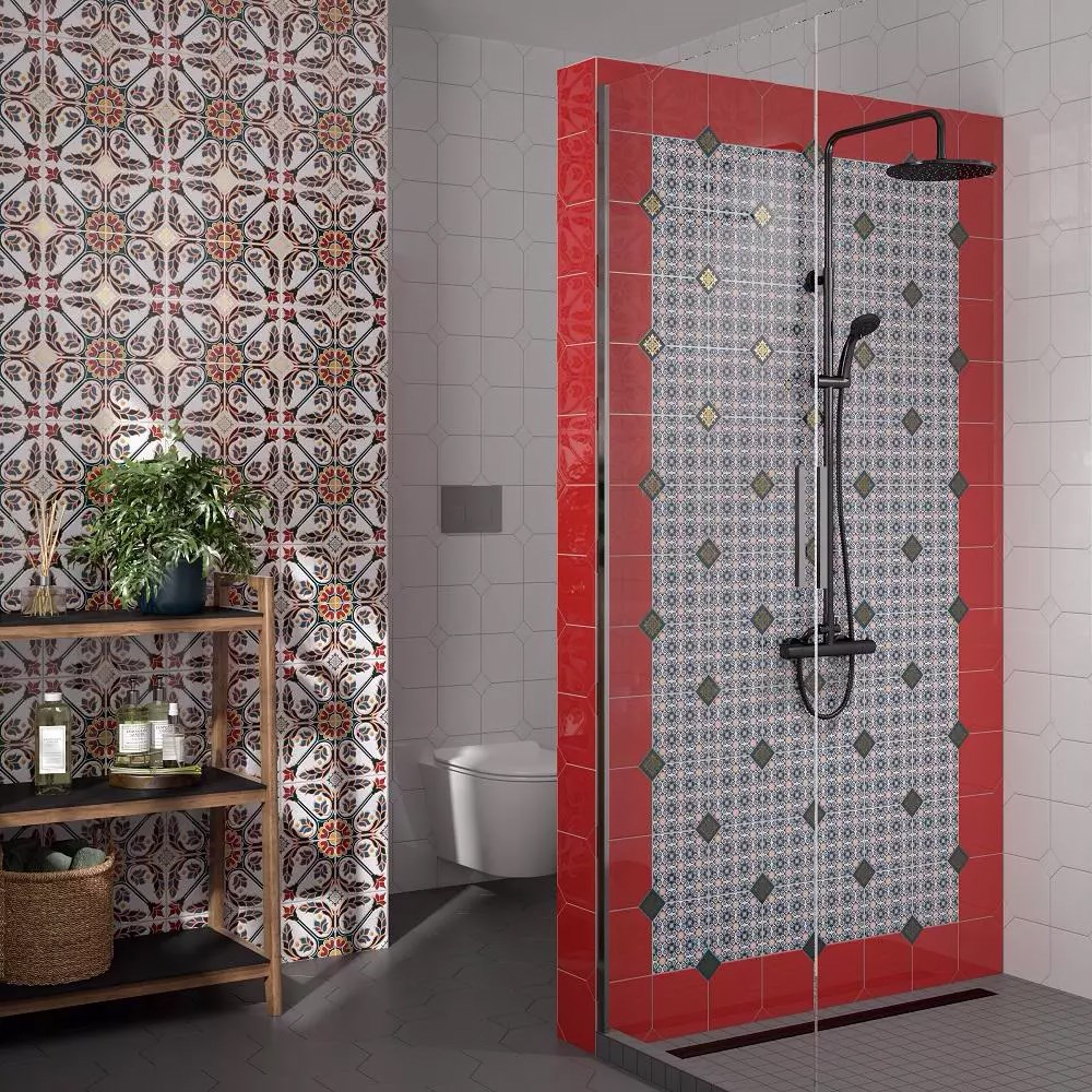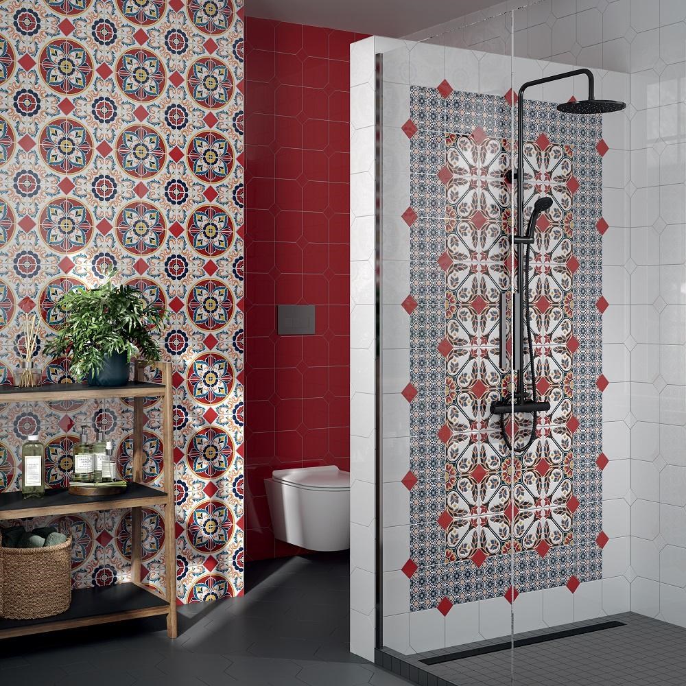 Яркий калейдоскоп создают шестиугольные плитки серии Болао. Насыщенные узоры из декоров 15х15 см складываются в эффектные орнаментальные розоны. Поверните плитки одной, другой стороной – получите совершенно разные рисунки. А добавите в раскладку квадратные вставки 4,9х4,9 см коллекций Граньяно или Клемансо – будет больше творческих экспериментов.