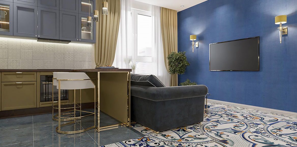 Оригинальной изюминкой в интерьере станет акцентная стена насыщенного цвета. Кстати, кроме эстетики, она решает важные задачи. Соединяет стены и пол, создает визуальный баланс – дизайн получается гармоничным. Если нужна корректировка помещения: часть, которую нужно «отдалить», оформите в светлом оттенке. Насыщенный тон зрительно «приблизит» стену. Синюю гамму обоев Оранжерея на акцентной стене поддерживает керамический гранит Мирадоро, расписанный авторскими узорами.