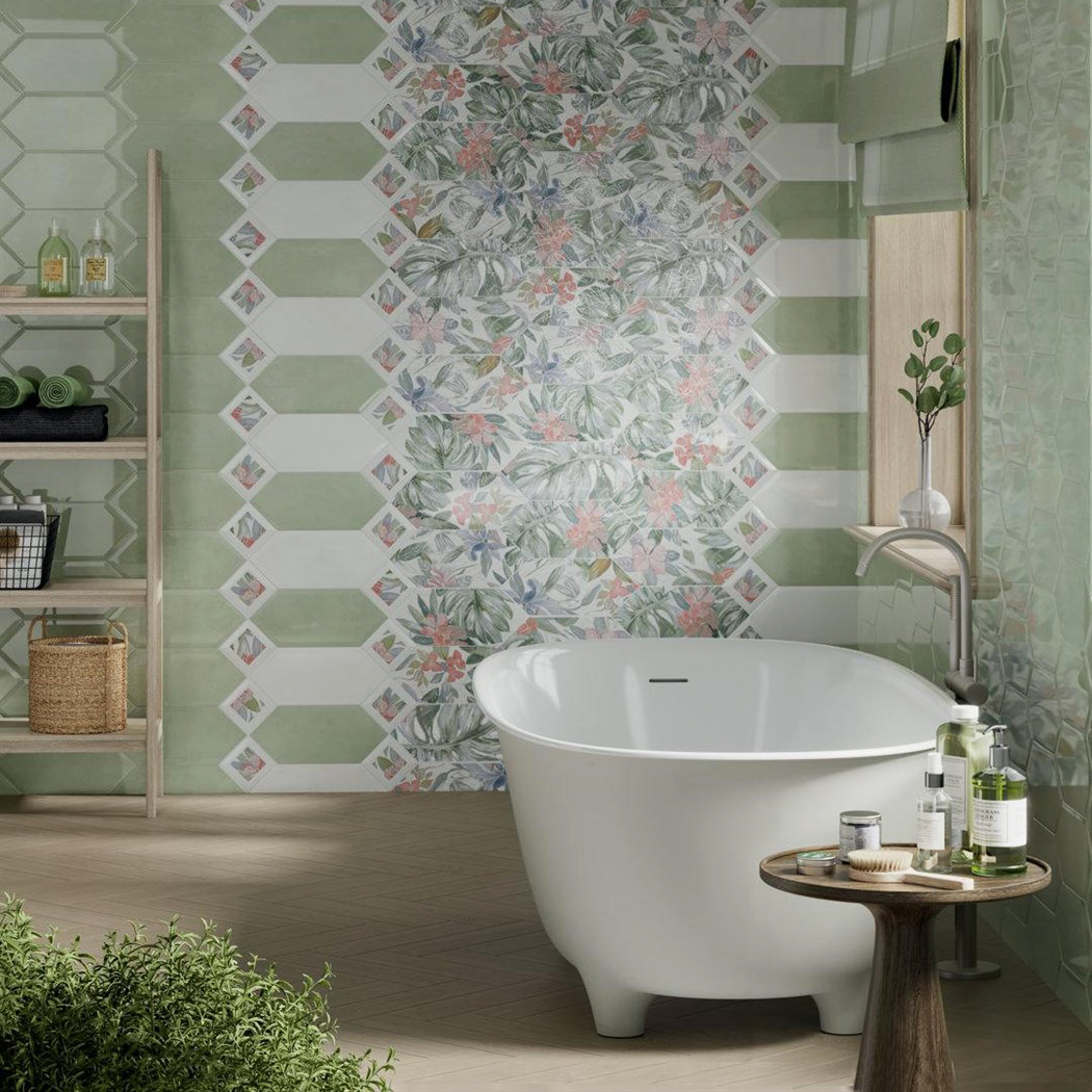 Представьте, дикая природа на вулканическом острове. Пышная, богатая растительность. Редкие цветы и травы. Пахнет зеленью и свежестью. Именно так на острове Сан-Мигел в Португалии. Эту атмосферу и колорит в интерьер передает серия керамической плитки Фурнаш. В рисунках оттенки терракотового, оливкового, горчичного и василькового. Поддерживает и обрамляет тропические сюжеты глянцевая фоновая плитка. Удлиненные шестиугольники 14х34 см делают дизайн особенным. Помогают зрительно расширить комнату, если уложите горизонтально. Вертикальная укладка визуально делает потолки выше.