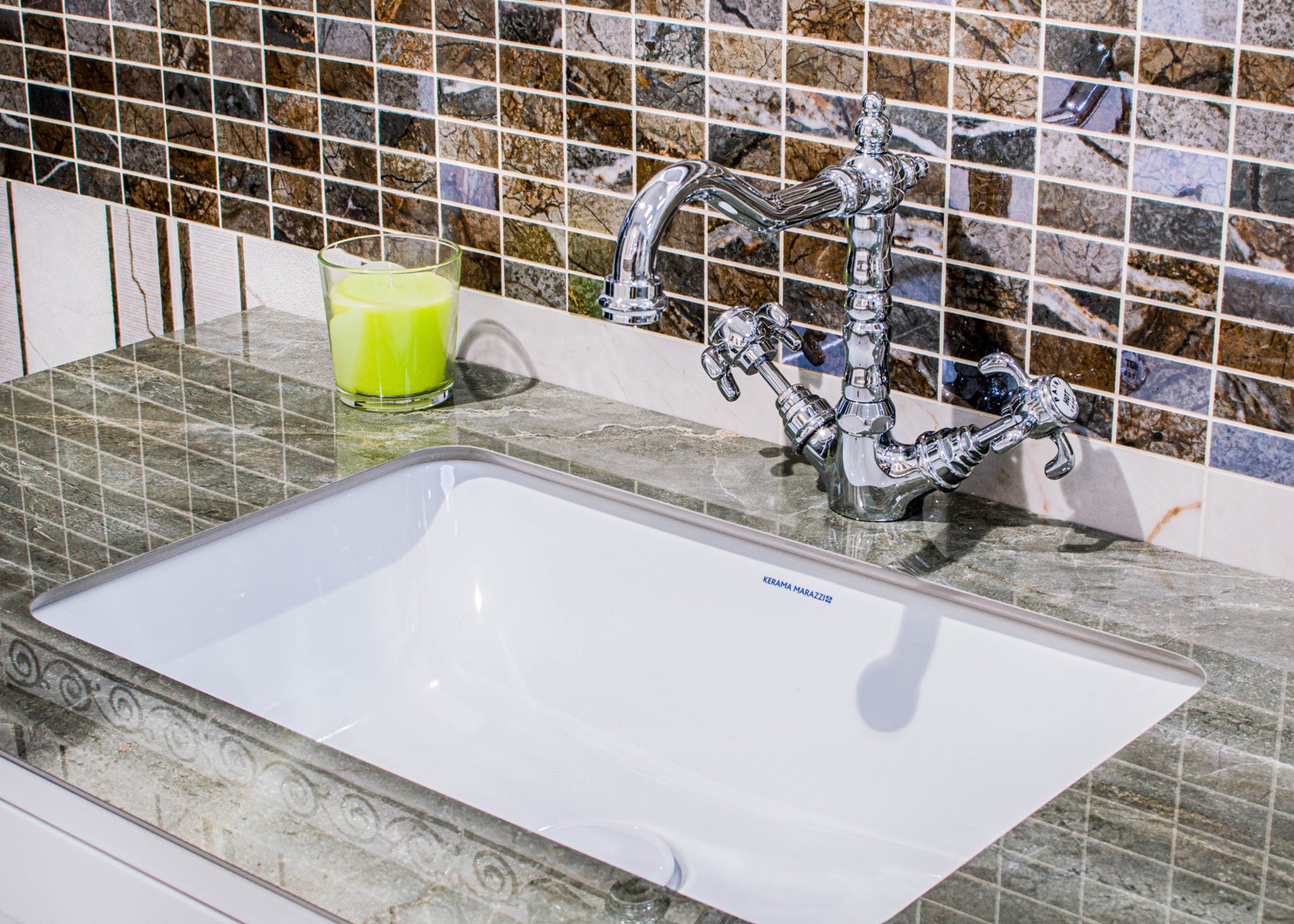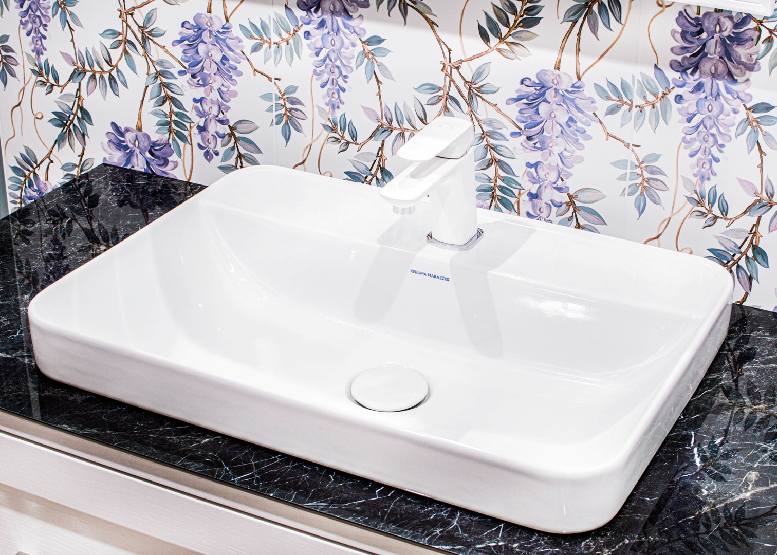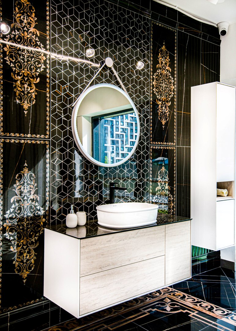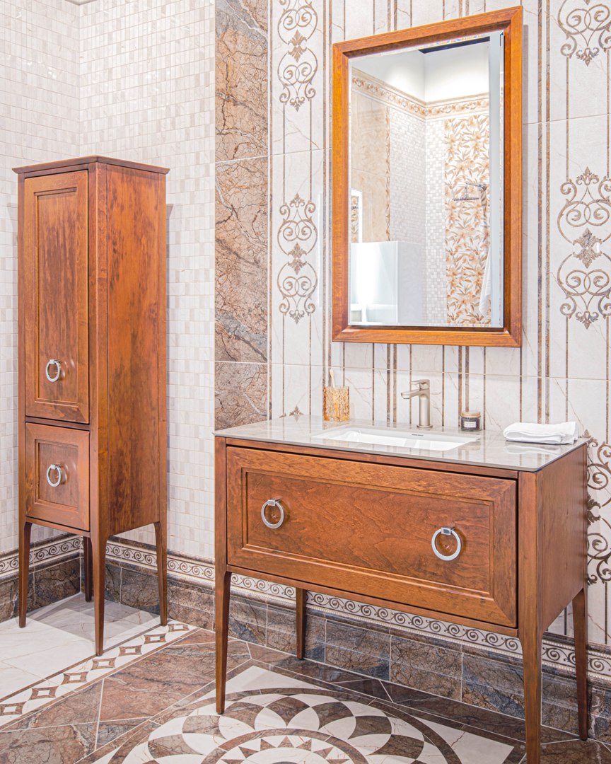 KERAMA MARAZZI предлагает множество комбинаций «раковина + столешница + тумба». К каждой из столешниц будет несложно подобрать напольные и настенные материалы, скоординированные по эстетике и рисунку. Комбинацию можно дополнить зеркалом и пеналом в том же стиле, сделав обстановку более завершённой.