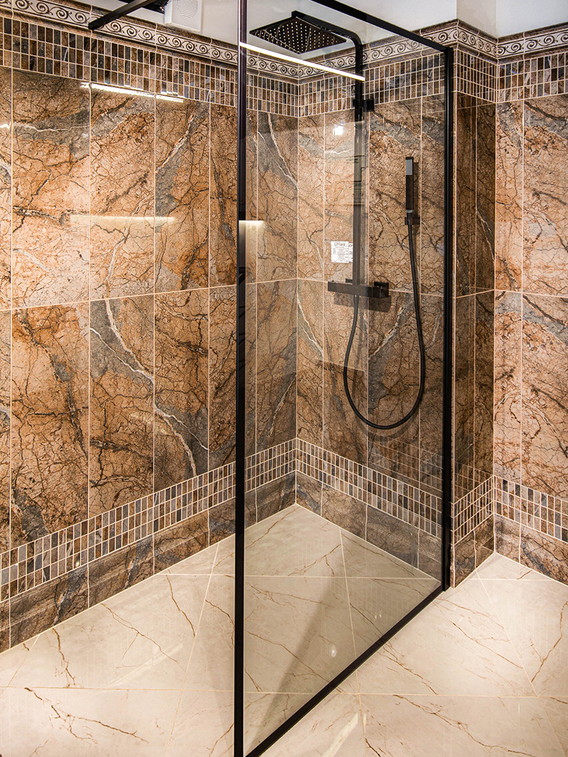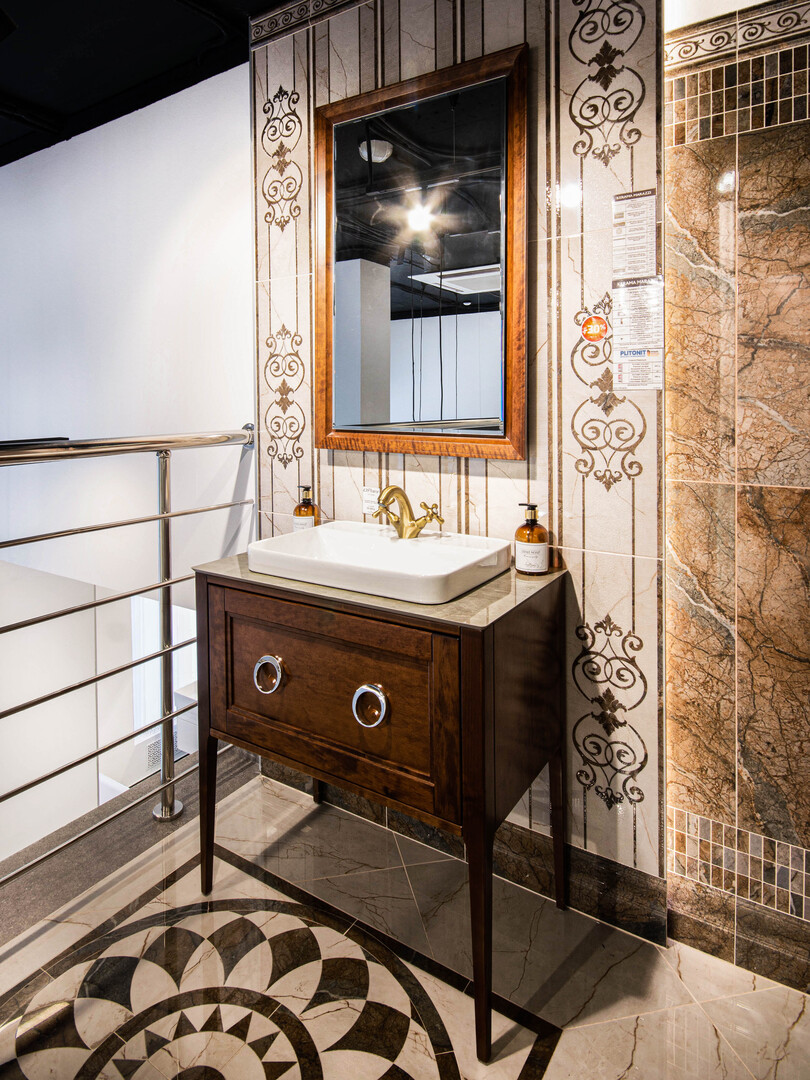 На фото. Коллекция глянцевой керамической плитки и керамического гранита Театро с фактурой мрамора. Рельефный узор на стенах и роскошный напольный орнаментальный розон с сочетанием теплых коричневых и дымчато-серых оттенков украшают интерьер. Мебель коллекции Plaza Classic из массива ольхи в цвете орех гармонирует с плиткой.