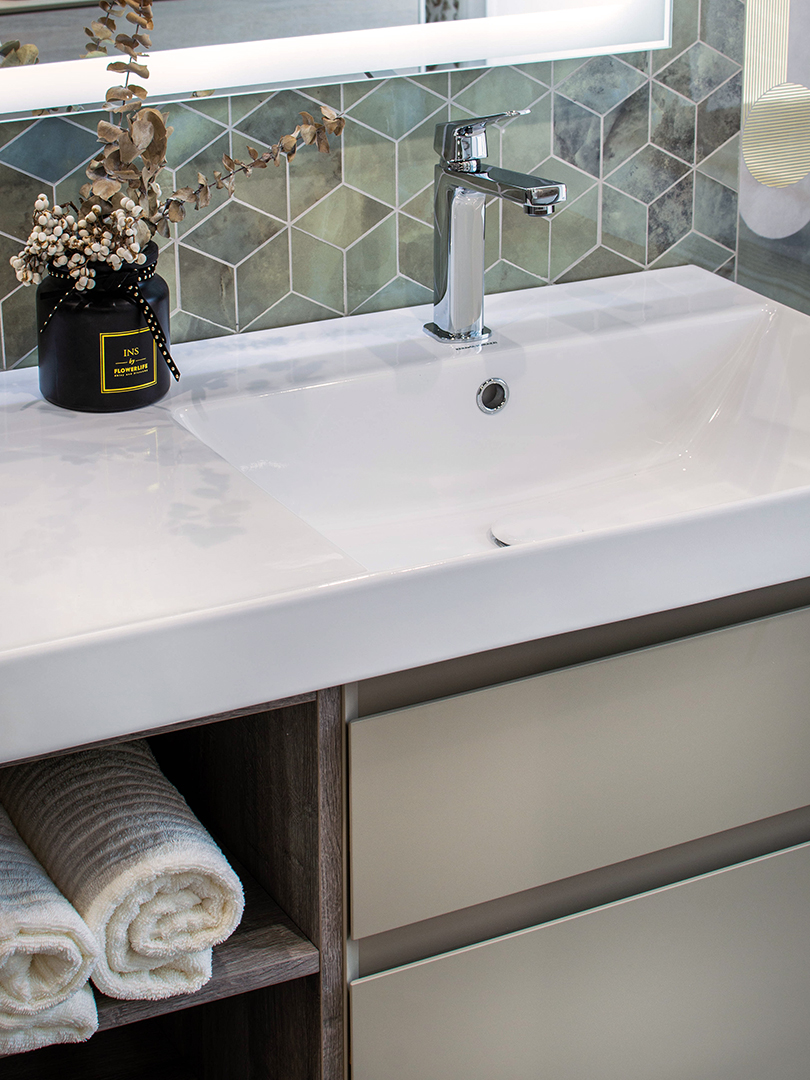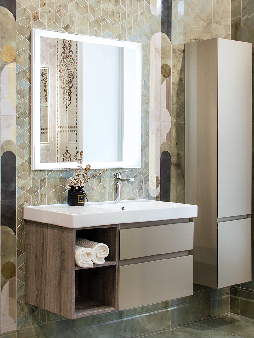 На фото. Коллекция глянцевой керамической плитки и керамического гранита с фактурой оникса Джардини. Декоративные вставки с геометрическим орнаментом, украшенные золотым составом, придают обстановке ту самую нотку роскоши. Функциональным интерьер делает мебель коллекции Cubo. Тумба с двумя открытыми полочками древесного оттенка и с двумя вместительными ящиками. Раковина с тонким краем в передней части и удобной площадкой под косметические принадлежности и аксессуары слева. Зеркало с LED-подсветкой, позволяющей регулировать уровень освещенности с помощью диммера.