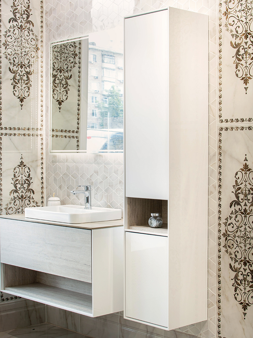 На фото. Коллекция керамической плитки и керамического гранита Греппи. Глянцевая поверхность, фактура мрамора, золотой орнамент с эффектом каменной инкрустации на декорах создают изысканную обстановку. А подвесная тумба серии Plaza Modern с матовым лаконичным фасадом под дерево «успокаивает» интерьер, делая его уютным.