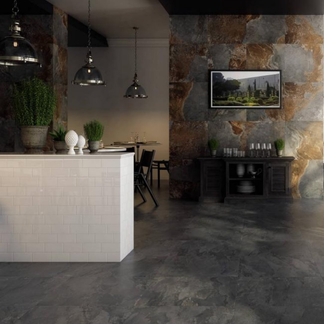 Керамическая плитка и керамогранит с фактурой камня и бетона идеальны для стиля лофт. Примеры на фото подтверждают наглядно.