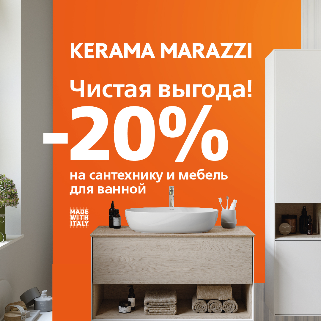 Скидки 20% на большой ассортимент продукции: санкерамика, мебель для ванных комнат, аксессуары и сопутствующие сантехнические товары.