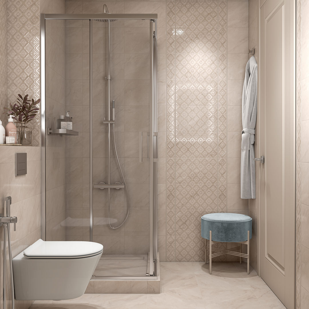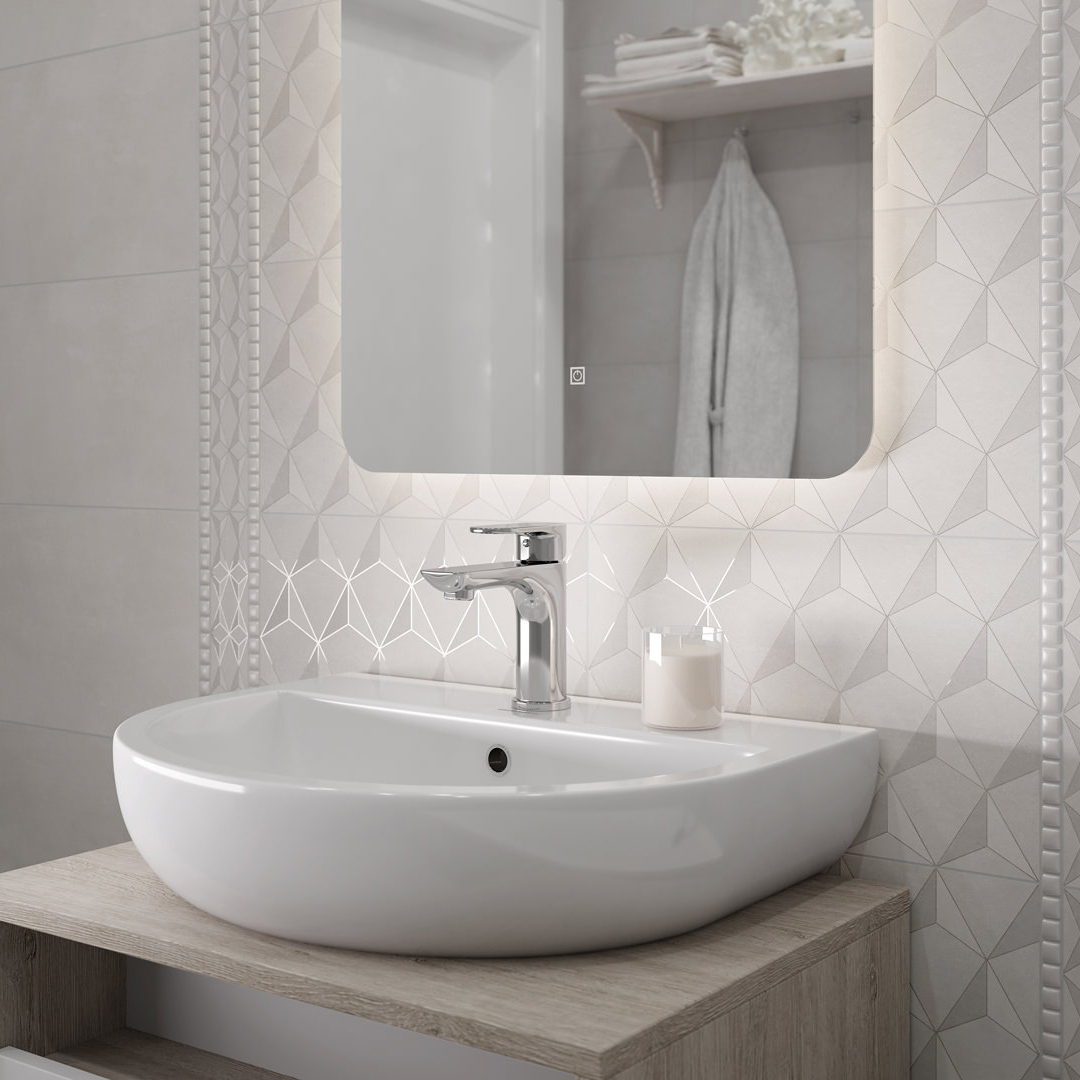 Керамическая плитка для стен и пола с несколькими модными изюминками: эстетика бетона, матовая поверхность и декоры с ультрасовременным 3D-эффектом. Геометрический орнамент с использованием графики создает видимость объёма. Часть паттерна переливается глянцевым блеском – подчеркивает выразительность рельефа. Чтобы завершить образ, разнообразить монохромный интерьер, серию дополняет бордюр. Все элементы в светлой серой гамме, которая зрительно добавляет пространства в комнате. Также привносит спокойствие в атмосферу, помогает расслабиться вечером, дарит мягкое пробуждение утром.