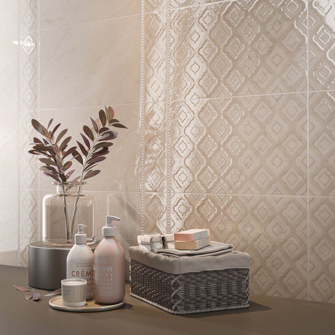 Изящная керамическая плитка в светлой гамме. Эстетика и глянец мрамора делает дизайн интерьера элегантным. Декоры серии добавляют изысканности. Напоминают нежное кружево, обрамленное шелковыми лентами и бисером. Подходит для оформления комнаты и кухни, санузла и прихожей. Создает гармоничный фон для акцентов разных цветов, будь то аксессуары, сантехника или мебель для ванной.