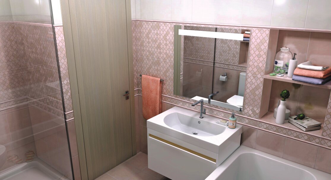 Новая серия Фоскари относится к керамической плитке эконом-класса, но при этом она достаточно большого формата 25х40 и дополнена оригинальными декорами. Настенная и напольная плитка представлена в трех цветах: бирюзовом, белом и розовом. Поверхность настенной плитки глянцевая, напольной – матовая.