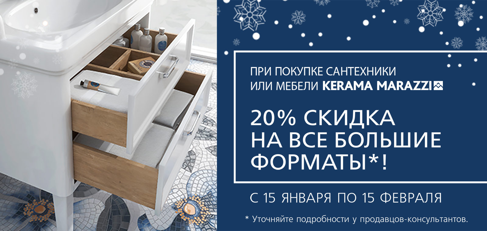 С 15.01.2019 по 15.02.2019 Kerama Marazzi объявляет акцию «Играем по-крупному» – скидка 20% на все большие форматы плитки при покупке комплекта сантехники или мебели Kerama Marazzi (любых 2-х артикулов).