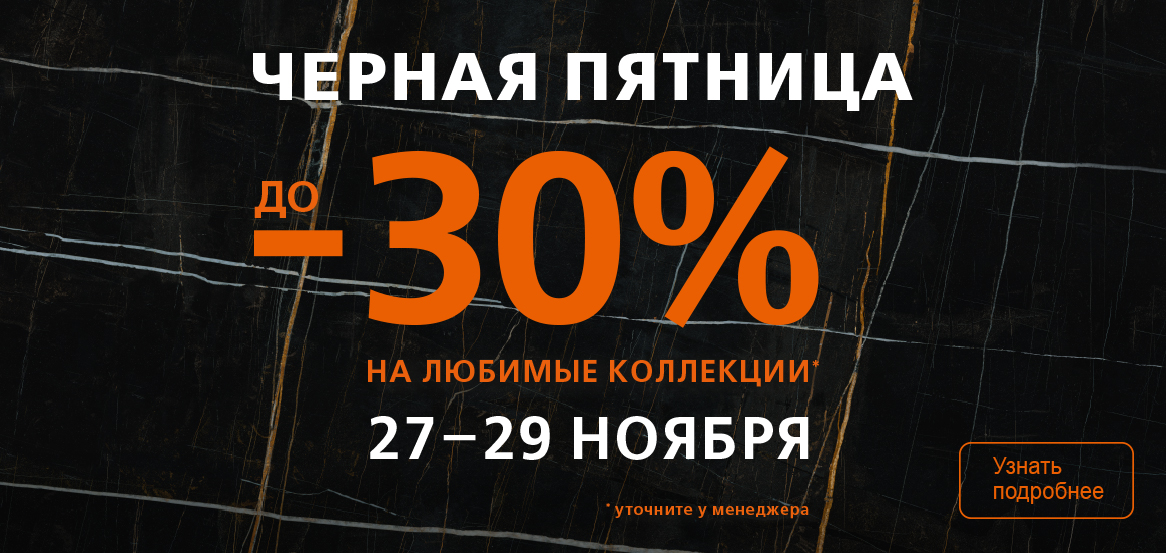 В сети фирменных салонов KERAMA MARAZZI 27 ноября в 9:00 стартует "Чёрная Пятница 2020". Скидки до -30% на любимые коллекции керамической плитки. Акция продлится всего три дня, до 29 ноября 21:00.
