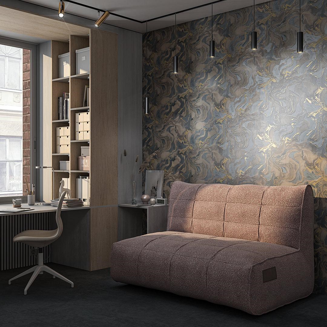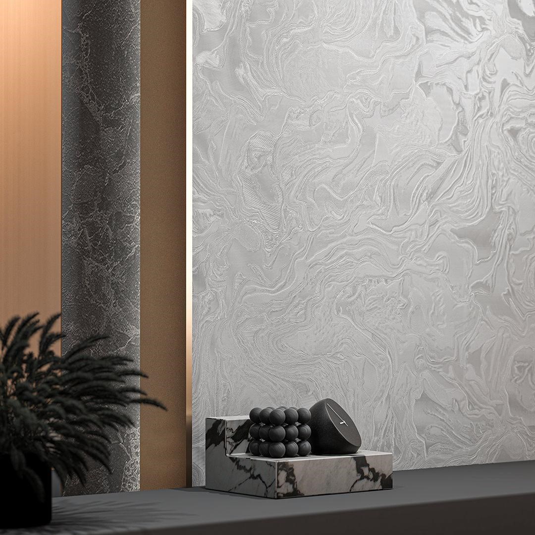 Рисунок новинки воспроизводит мраморные прожилки благодаря детальной графики и деликатному тиснению, делая поверхность обоев похожей на вытканный фантазийный узор. Глиттер с эффектом крупных блёсток придает мерцания, оживляя рисунок в лучах света.