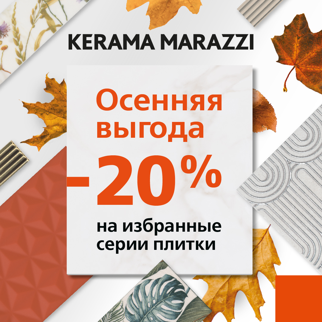Избранный ассортимент керамических материалов KERAMA MARAZZI со скидкой 20%! Плитка и декоры, бордюры и плинтусы сделают вашу отделку неповторимо выгодной.