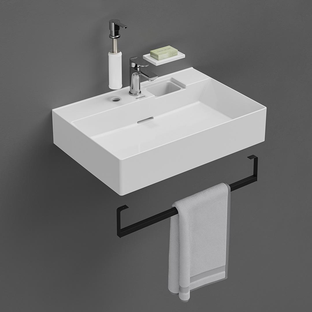 Невидимый слив Beauty Drain смещён из центра чаши к задней стенке, отверстие перелива спрятано в небольшой бокс, закрытый керамической крышкой. Установка раковины возможна как на подвесную тумбу, так и в варианте без мебели.