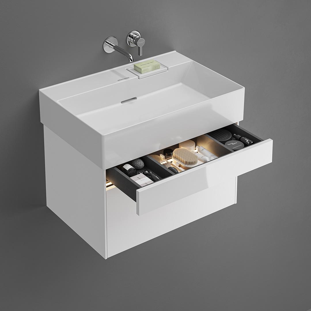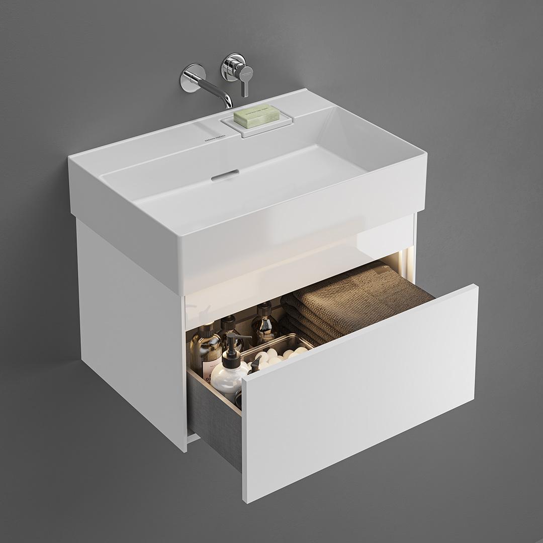 Тумбы Logica представлены в трех цветах: белоснежном, стальном, песчаном. Два выдвижных ящика оснащены подсветкой, даря обладателям новый уровень комфорта и повседневного удобства.