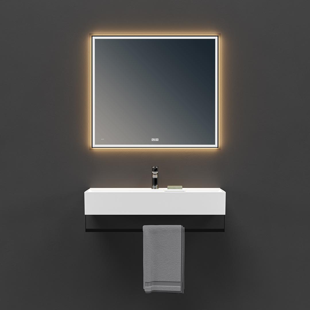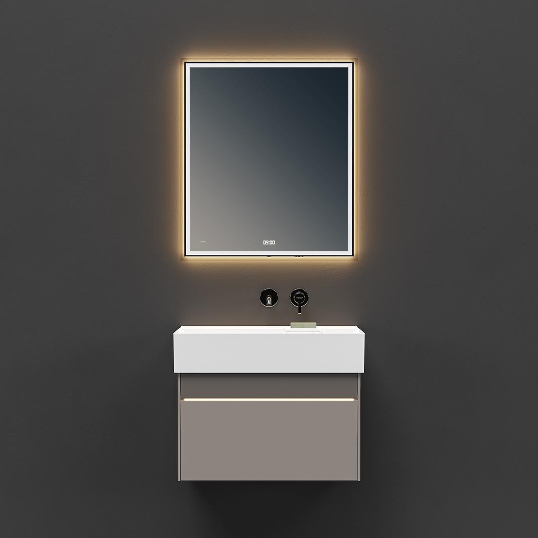 Подсветка прямоугольного зеркала Tecno включается и выключается бесконтактно по взмаху руки. Также регулируется характер освещения: холодное, тёплое, естественное. Функция «антизапотевание» и косметическая линза, доступная в зеркале шириной 90 см, делают новинку более удобной, а рама из прозрачного стекла с сатиновым эффектом и подсветка по периметру – современной и стильной.