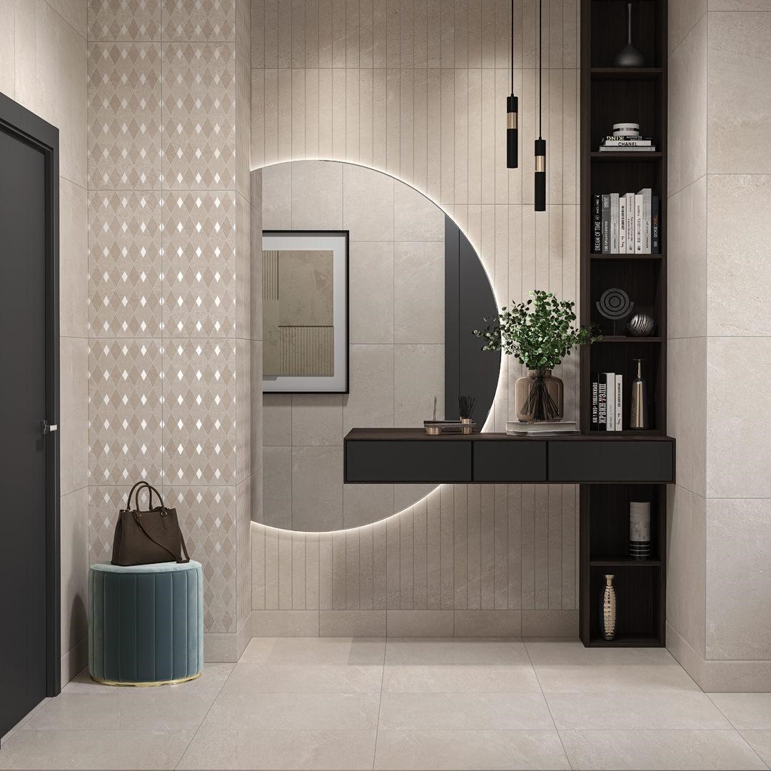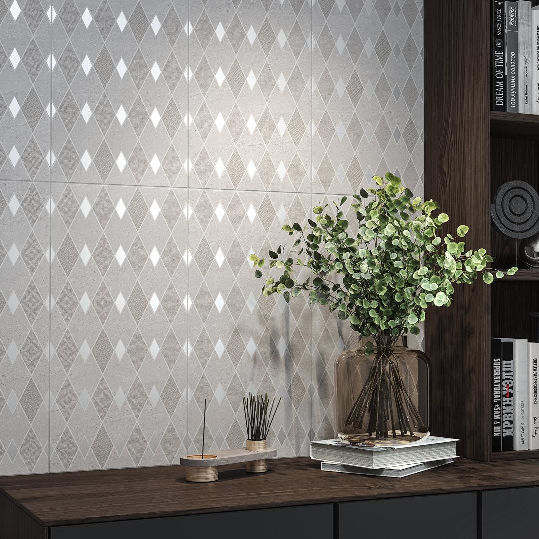 Топовая серия керамогранита Про Матрикс дополнена настенной керамической плиткой. Новинка в лаконичном дизайне. Базовая плитка с гладкой матовой фактурой камня. Белая, в нежно-сером цвете и кремовый беж. Декоры украшают стильные геометрические узоры, будто резка по камню или роспись серебром.