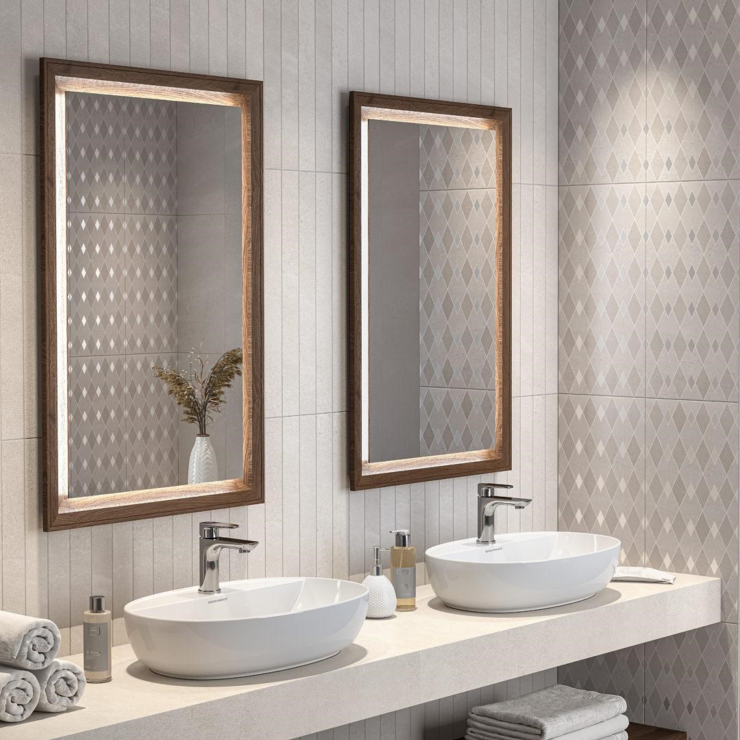 Дополняют и завершают образ бордюры и карандаши, вставки и плинтусы, плитка с преднарезкой. Эффект крупной мозаики, но без дополнительных затрат и сложностей в укладке.
