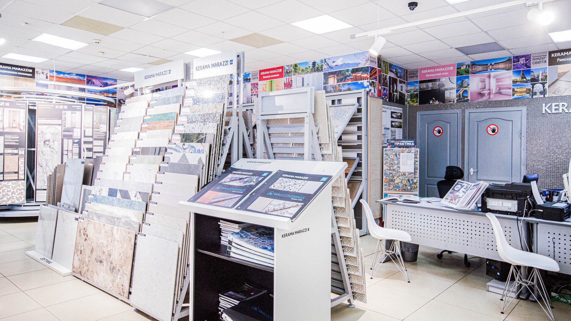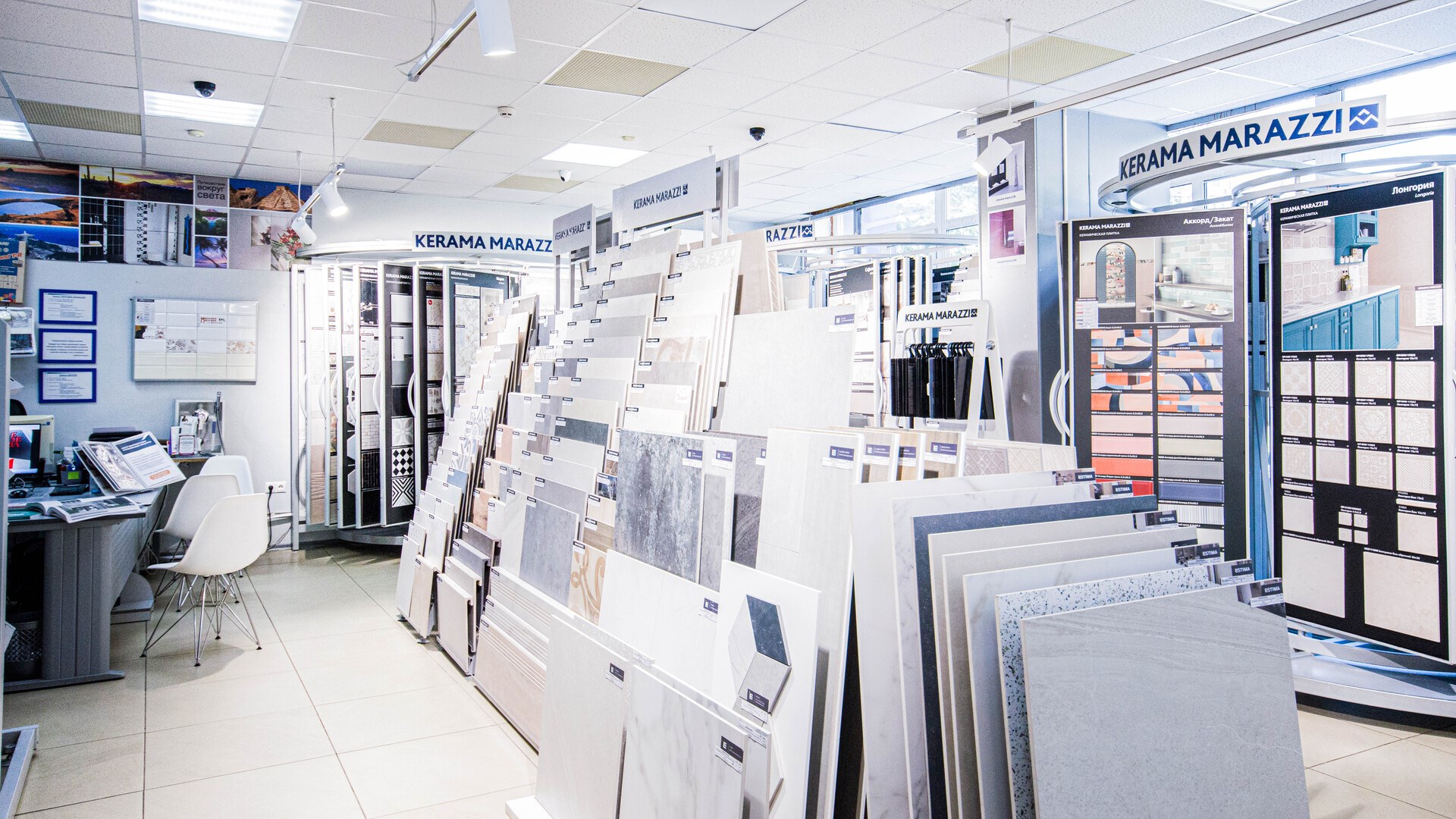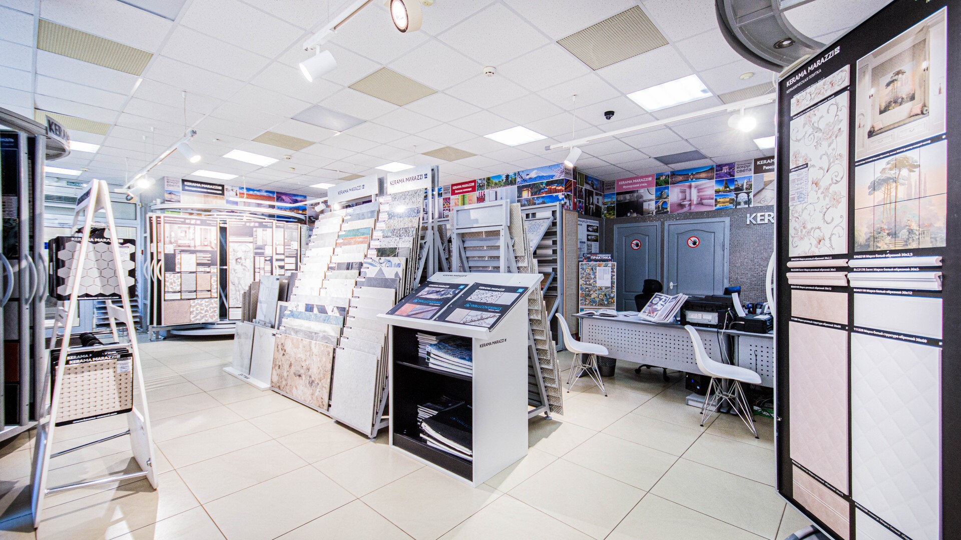 На центральной улице города отдел KERAMA MARAZZI. Фирменный, поэтому здесь практически полный ассортимент продукции, дизайнеры с дипломами и сервис уровня ультрасовременного салона. Найдете все для ремонта в одном месте: от идей и вдохновения до воплощения. А также доставка. Вы выбираете с нашим дизайнером или самостоятельно коллекции плитки и керамический гранит со стендов. На выставке обои, сантехнику и мебель для ванной комнаты. В подарок вы получаете эскизный проект будущего интерьера в 3D формате. Строители, дизайнеры и архитекторы, приглашаем к сотрудничеству! Предлагаем особые, комфортные условия. С нами вы экономите время.
